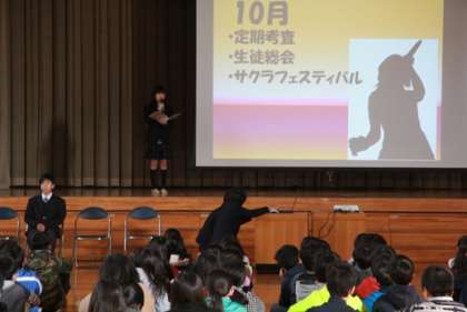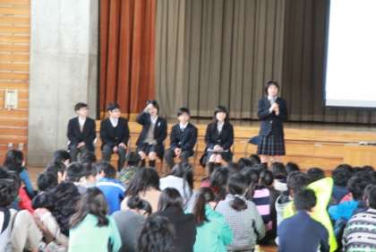 2月15日(月) 近隣の小学校6年生に向けて、生徒会役員が説明会を開きました。今日は、お隣の桜丘小学校で実施しました。桜丘中学校の生徒会の組織、委員会活動、1年間の行事、部活動について、動画を含めたパワーポイントや寸劇を使って説明しました。小学生も興味を持って聞いていました。