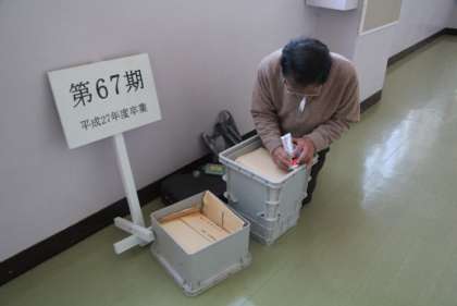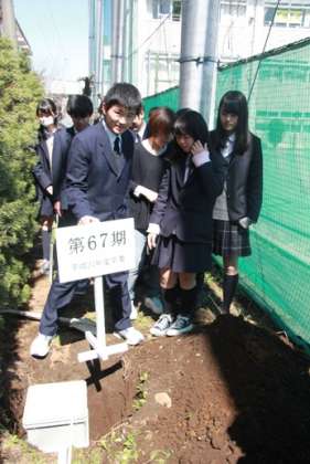 3月17日(木)3年生の5年後の自分に宛てた手紙や、在学中の作文など思い出の品々を入れたタイムカプセルを校庭に埋めました。この、タイムカプセルは、5年後の成人式に開封します。毎年100人以上の卒業生が、成人式を終えて学校に集まります。記念の品をもらったり思い出のビデオを見たりしてひととき当時の担任の先生たちと過ごします。