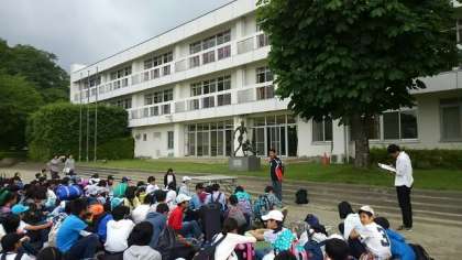 1年生の移動教室一日目、時折陽射しのある曇り空の中、富士山御庭散策、河口湖フィールドセンターの活動を無事に終え、河口湖林間学園に到着しました。