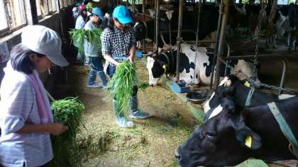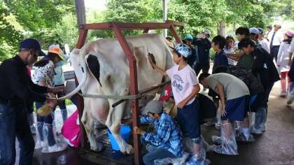 牧場での酪農体験(牛への餌やり、乳搾り、バター作り)を経験し、ミルクランドでお弁当を食べ、帰路につきまた。