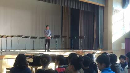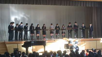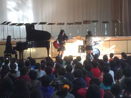 12月12日(月)今日は、笹原小学校の児童朝会にお邪魔して、本校のハンドベル隊とバンドのフリッシュが演奏を披露しました。