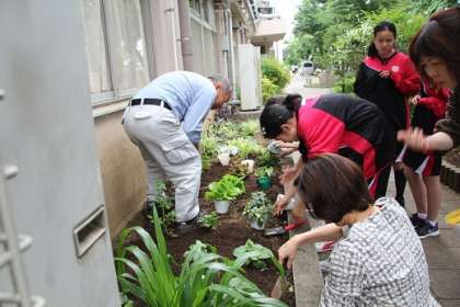 また、ババロアが冷蔵庫で固まるまでの間に、外の花壇に料理に使うハーブの苗を植えました。今後は、このハーブ園のハーブを使った料理も計画しています。