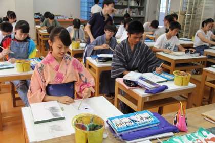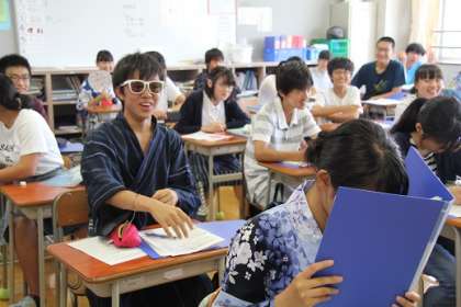 浴衣で授業を受けているという他校では絶対に見られない光景です。浴衣で授業をする先生方もいて和やかな一日になりました。