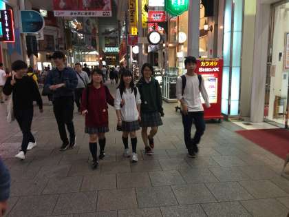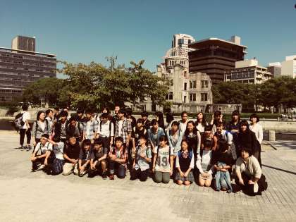 広島の平和記念公園では、安田女子学園大学の国際観光科の学生さん12人がボランティアで生徒の皆さんを案内して下さいました。いつもは元気な生徒たちも平和記念資料館を見学した後は原爆の悲惨さに声もない という表情でした。フィールドワークを終えて宿舎に帰るとまたいつもの元気な生徒たちに戻ってホッとしました。夕ご飯は宿ではなく、班ごとに事前に調べておいた町のお好み屋さんに繰り出しました。どの班のお好み焼きが一番美味しかったでしょう?