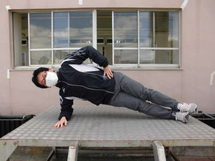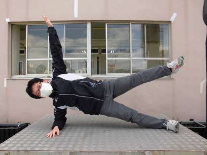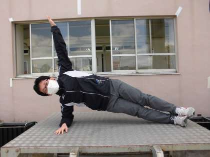 今回は左右の体幹です。これも腰が下がらないように気を付けてください。おへその下を集中させ、腰を少し上げるくらいの気持ちで。腕は腰に置いても、上げてもOK。応用編として片足を上げてみてください。 さあ、チャレンジ!