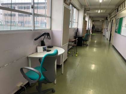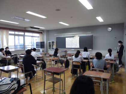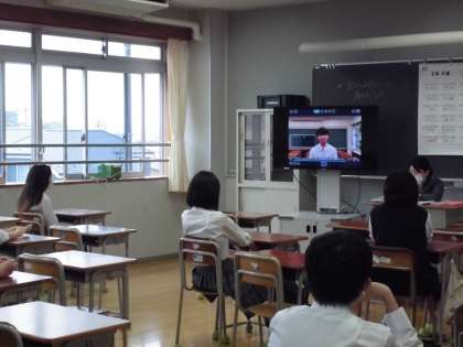 今日からの分散登校は2部制です。午後は1時10分から始まりました。午前と同じように机移動、放送での始業式、リモートで着任した先生方の紹介を行いました。そのあとは学活です。なお、右の写真にありますようにヘルプデスクも三密を避けるため一つの机につき一人の利用となりますのでご理解ください。