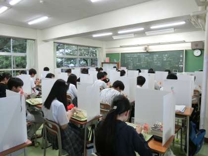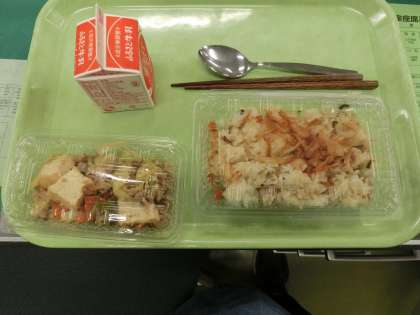 本日より給食が始まりました。今週一週間は、感染症拡大予防を最優先とした簡易給食といたしております。簡易給食では2種類の料理数として、可能な限り給食室で個包装して提供します。本日は、牛乳、五目チャーハン、生揚げと野菜の味噌いためです。