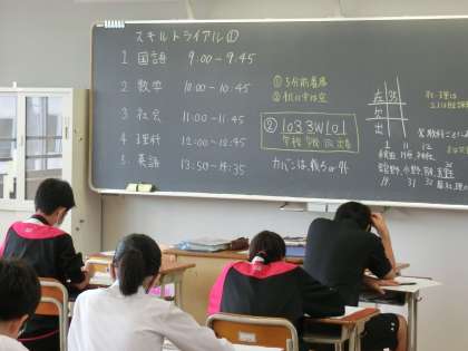 今日は3年生のスキルトライアル(実力テスト)が行われました。5教科について、これまでの学習の成果を試すよい機会となりました。また、今日は3年生のテストにあわせて授業ごとにチャイムが鳴ります。桜丘中では普段鳴らないので逆に戸惑った人もいるかもしれませんね。