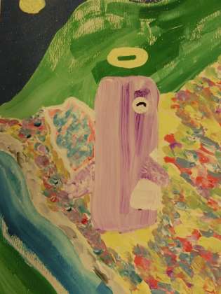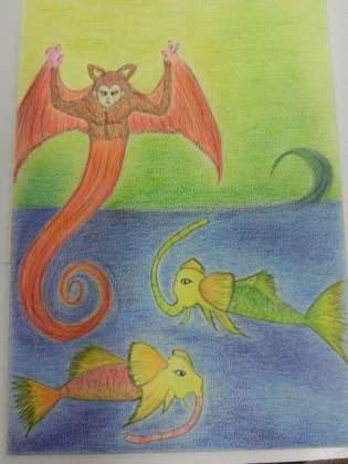 3年美術の課題は「想像上の動物」です。絵具や色鉛筆を使い、面白い作品が仕上がりました。