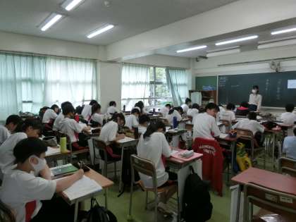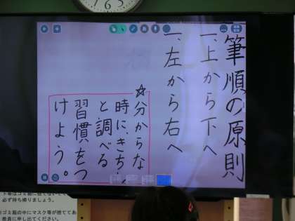 1年生の書写(硬筆)の授業です。お手本と画像の注意事項を確認しながら真剣に取り組んでいました。