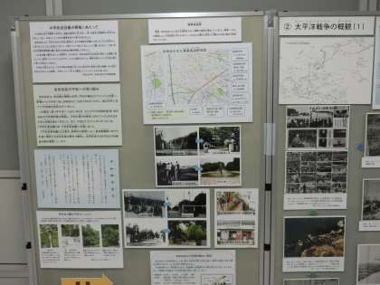 世田谷区立平和資料館の巡回展が始まりました。テーマは「太平洋戦争の歴史と戦時下の人々の暮らし」です。太平洋戦争の概観や東京大空襲の様子、当時の人々の暮らしの様子などがパネル展示されています。また当時実際に使われた生活用品や軍で使用されたヘルメットや手りゅう弾などの展示もあります。期間は本日より12日(月)までで、北校舎一階の廊下に展示してあります。