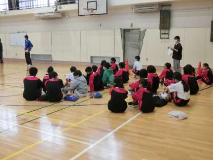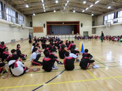 今日の1時間目は1年生、3、4時間目は2年生の学年練習が行われました。雨のため体育館で個人種目の走順とコースの確認を行いました。