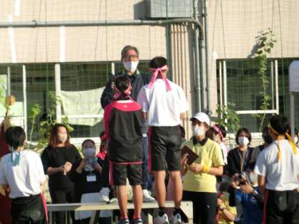 表彰です。各学年優勝、準優勝クラスにトロフィー・楯が校長先生から手渡されました。雨で日程が変更になりましたが、今日は心地よい秋晴れの下無事運動会を終えることができました。コロナ対応で活動が制限されている中、生徒たちは一生懸命頑張り最高のパフォーマンスを見せてくれました。また、今日までこうした活動にご理解とご協力をいただきました保護者の皆さま、地域の皆さま、関係各機関のみなさまには大変感謝いたしております。ありがとうございました。