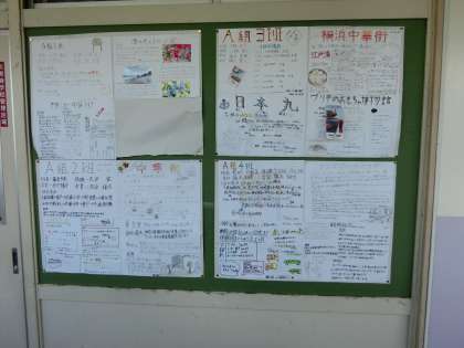 1年生は校外学習の事後学習を行いました。班で分担を決め、各自で調べた内容を画用紙まとめ、班ごとに模造紙に張り出しました。1年生の教室の前の廊下に掲示してあります。