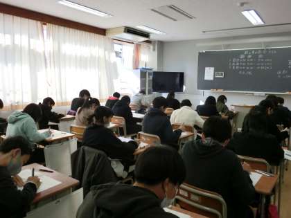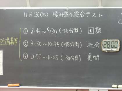 今日から土曜日まで1,2年生の積み重ね総合テストが行われます。今日は国語、社会、美術を実施いたしました。明日は、数学、理科、技術家庭の3教科です。