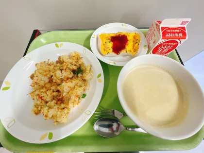 今日の給食は図書コラボ給食です。『きょうの猫村さん』という本に出てくる猫の家政婦、猫村さんの得意料理≪ネコムライス≫を作りました。