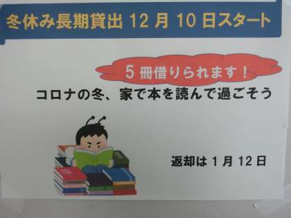 本日12月10日より冬休み長期貸出期間が始まります。ひとりにつき5冊まで借りることができます。返却期限は1月12日です。