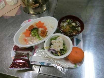 17時からは楽しみな食事の時間です。今日のメニューはクリームシチュー。感染症予防のためパーテーションで仕切りながらの食事です。