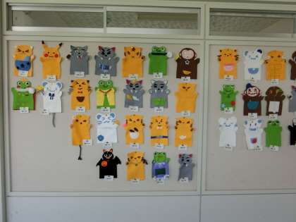 11月にご紹介いたしました3年生の家庭科の作品「ハンドパペット」を調理室前の廊下に展示いたしました。ユニークなデザインがたくさんあります。