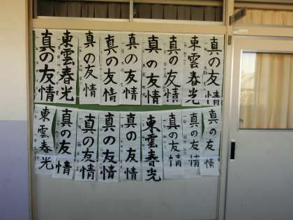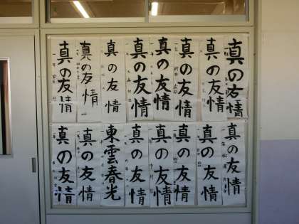1年生の書初めの作品です。1年生の教室の前に掲示してあります。東校舎の2,3階、北校舎の3階になります。力作ぞろいです。