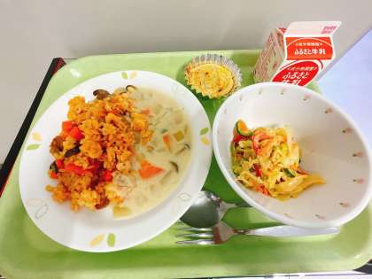 たまねぎ(北海道)、にんじん(千葉)、しめじ(福岡)、キャベツ・レモン(愛知)、きゅうり(群馬)、赤ピーマン(高知)、パセリ・さつまいも(茨城)、鶏肉(茨城・栃木・宮崎)、えび(インド)、鶏卵(栃木)