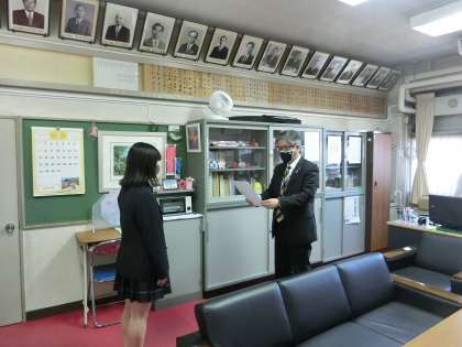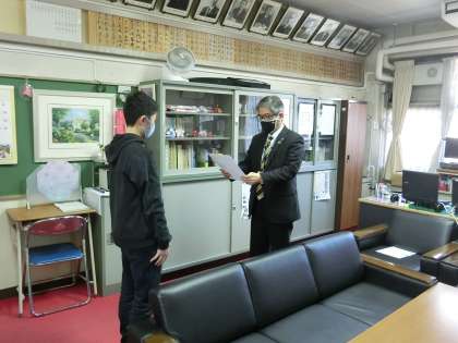 日程の都合でできなかった陸上部の秋季大会の表彰を本日昼休み校長室で行いました。男子100Mで2年生が7位に、女子走り幅跳びでは2年生が8位に入賞しました。
