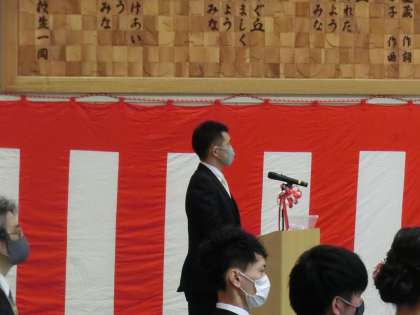 副校長の司会で進行いたしました。国歌斉唱はあらかじめ録音した音楽の先生の伴奏、音楽の先生による斉唱をながし心の中で斉唱しました。学事報告は印刷物をもってかえさせていただきました。
