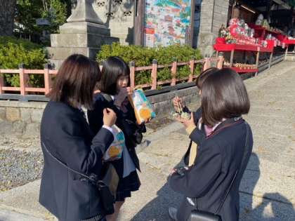 神社の屋台名物を食べる生徒たち。 旅の醍醐味ですね♪