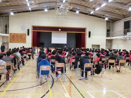 今日の1時間目は1年生が格技室、2年生が体育館で学年集会を行いました。学級委員の司会で1年間の成長の軌跡を振り返りました。学年の先生方からも熱いメッセージが寄せられました。