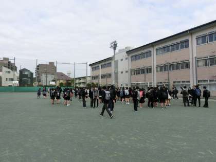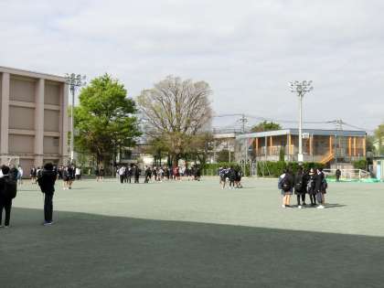 いよいよ新年度のスタートですね。登校してきた2,3年生が校庭に集まってきました。なぜ教室に入らないかというと・・・?