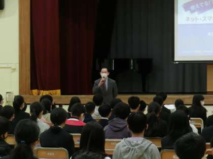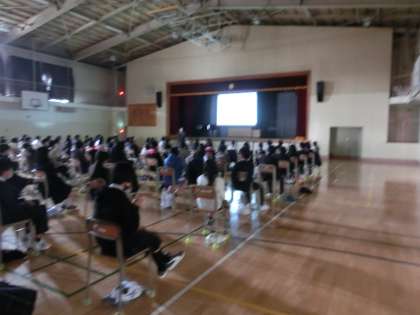 5時間目の1年生は、体育館で情報モラル講習を受講しました。ゲストティーチャーを招いてインターネットやSNSに関するトラブルやその回避法について学びました。