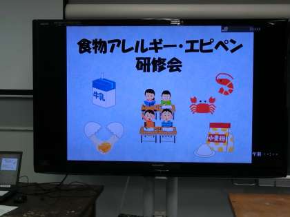 本日の放課後、全教職員がアレルギーへの対処法とエピペンの使用方法についての講習を受講しました。