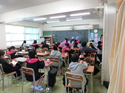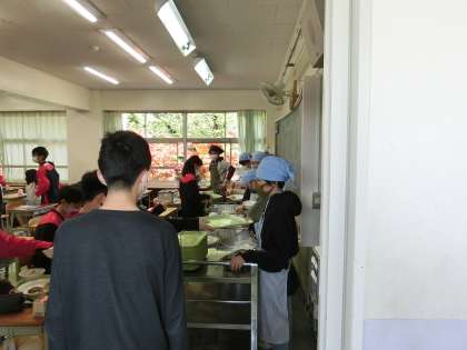 1年C組、D組の給食準備の様子です。当番を中心に協力してできていました。順番がくるまでは静かに着席して待っていました。