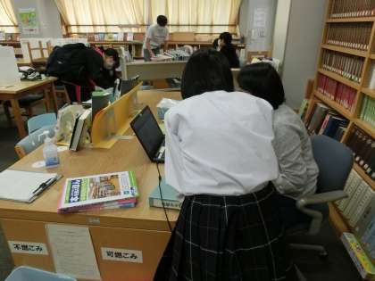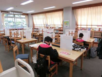 個別面談期間中は図書室が面談の控室になっています。本を探す生徒、読書をする生徒、練習問題に取り組む生徒など様々ですが、みんな静かに利用していました。