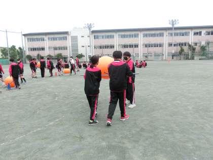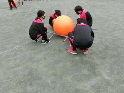 2年生の学年種目 #(ハッシュタグ) 2年生体育委員が考案したオリジナル競技としか聞いていませんでいしたが、今日そのベールを脱ぎました。4人1組になって4本の棒を機#(ハッシュタグ)状(井桁状)に組、その上にバランスボールを乗せて運ぶ競技です。棒を組む時の力の入れ方、走るときの体の向きなど工夫するところ満載。競技のやり方、ルールはもちろんネーミングも体育委員が考えました。