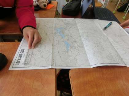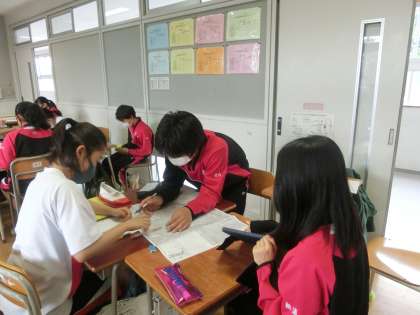 2年生の社会授業です。世田谷と河口湖周辺の2.5万分の1の地形図で、2地点間の直線距離、等高線から標高を読み取るといったきことを班ごとに学びあいました。