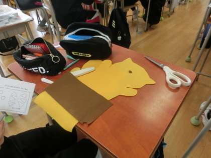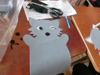3年生の家庭科では動物の顔をデザインしたハンドパペットの製作を行っています。今日は顔の部分を型紙を使って布を切り取り貼り付ける作業を行いました。動物の種類は各自で選べます。