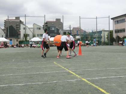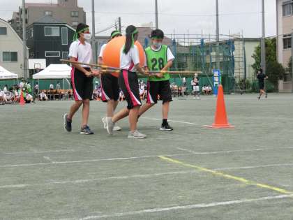 本年度から新たにスタートした2年学年種目の#(ハッシュタグ)です。四本の棒を#に組んで大玉を運ぶリレー形式の競技です。速さ、バランス、チームワークなど様々な要素が取り入れられています。練習の時から比べてどのクラスも上手に運ぶことが出来ました。