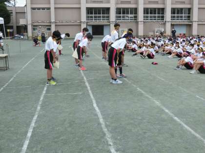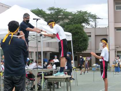 各学年の優勝、準優勝クラスが表彰されました。また、部活動対抗リレー優勝のサッカー部、陸上競技部も表彰されました。なお、各種目の個人賞は後日表彰いたします。この表彰式のあと体育委員の閉会の言葉で運動会は終了いたしました。緊急事態宣言下での開催で例年より規模を縮小しながらも無事に終了することが出来ました。これも、ひとえに保護者の皆様のご理解とご協力があってからこそと感謝しております。ありがとうございました。今後ともなお一層本校の教育活動にご理解とご協力をいただけますようお願い申し上げます。