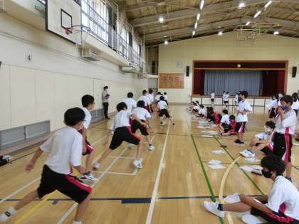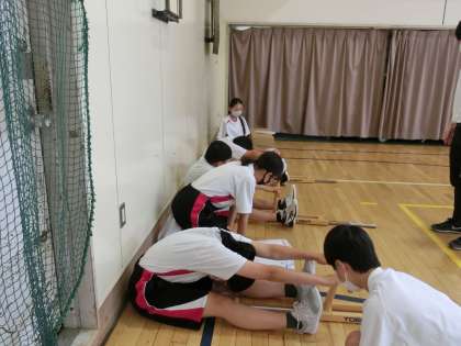 1年生の反復横跳びと長座体前屈の様子です。どの学年も1クラスを4つのグループに分け各種目をローテーションしながら測定しました。