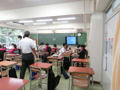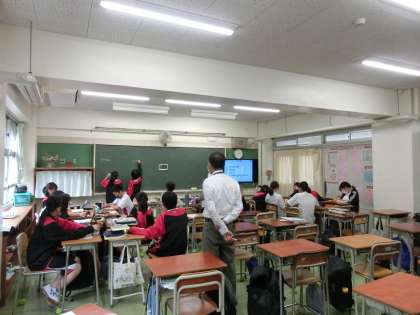 1年生の英語の少人数授業では、世田谷区教育委員会より指導教官をお招きして研究授業を行いました。会話を聴いて得た情報や絵を見て説明するところでは、班で話し合いロイロノートで情報を共有いたしました。