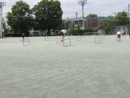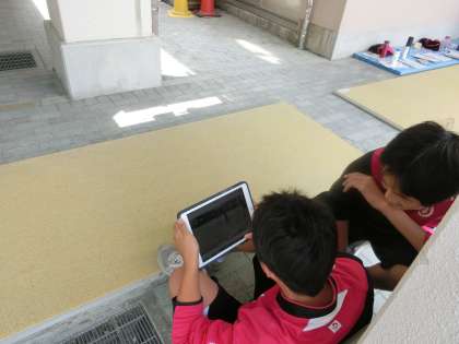 3年生の体育の授業ではハードルを行っています。上の画像は跳んだあとフォームを確認しているところです。体育の授業中にタブレットで遊んでいるのではありません。