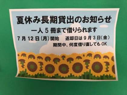 図書室よりの連絡です。12日(月)曜日より夏休み中の図書の貸し出しを始めます。一人5冊まで借りることが出来ます。是非利用してください。