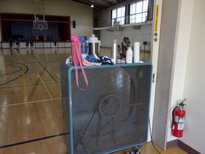 体育館ではエアコン、送風機のほか大型扇風機を使って熱中症予防を行っています。もちろん水分をこまめに補給しています。