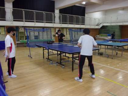 今日の午前中は剣道部と卓球部で格技室を半面ずつ使用しました。卓球部では顧問の先生がドライブの打ち方を直接指導しました。