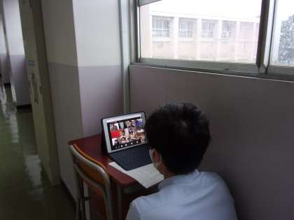 朝岳活で出席確認した後、担任の先生が自宅学習の生徒とTeamsを使っての対話で様子を確認しています。本日は漢字チャレンジのため副担任の先生が教室でテスト監督を行い担任の先生は廊下で対話をするといった場面も見られました。