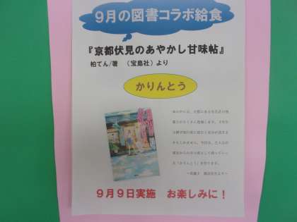 今日は今月の図書コラボ給食の日でした。今日は柏てん著「京都伏見のあやかし甘味帖」にでてくる”かりんとう”が出されました。あまくてパリッとした歯触りでとてもおいしくいただきました。