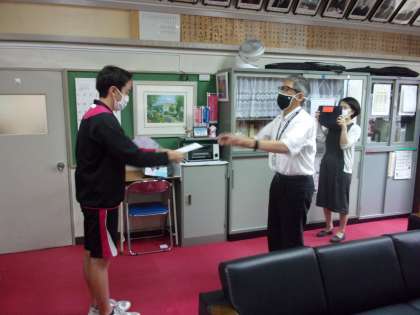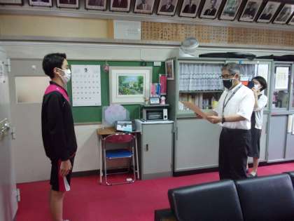 3年生男子が東京中学校総合体育大会で100mバタフライ 200mバタフライともに優勝し全国大会にコマを進めました。また全国JOCジュニアオリンピックカップの200mバタフライで5位に入賞しました。今日はその表彰を校長室で行いました。なお本日の表彰の様子は後日各教室に配信されます。