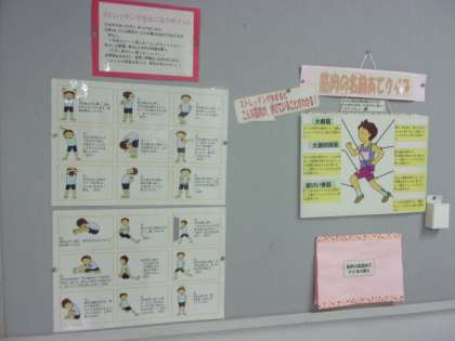 コロナ禍で運動不足になりがちな人もいるかもしれませんね。保健室前には誰でも簡単にできるストレッチの方法を掲示してあります。是非やってみては・・・・