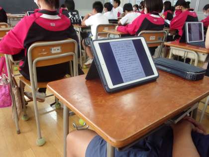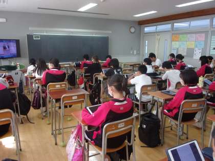 今日は生徒会役員選挙の日です。写真は立会演説会の様子です。立会演説会は予め動画撮影したものを各教室および各自のタブレットにロイロノートとTeamsで配信しました。各教室では全体画面では演説の様子を各自のタブレットでは選挙公報をひらいて立候補者の演説を視聴しました。なおこの様子は在宅でもロイロノートまたはTeamsで視聴できます。